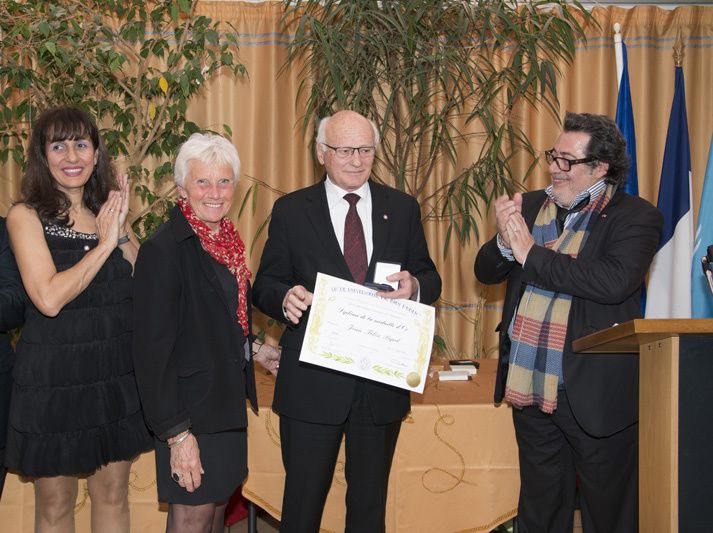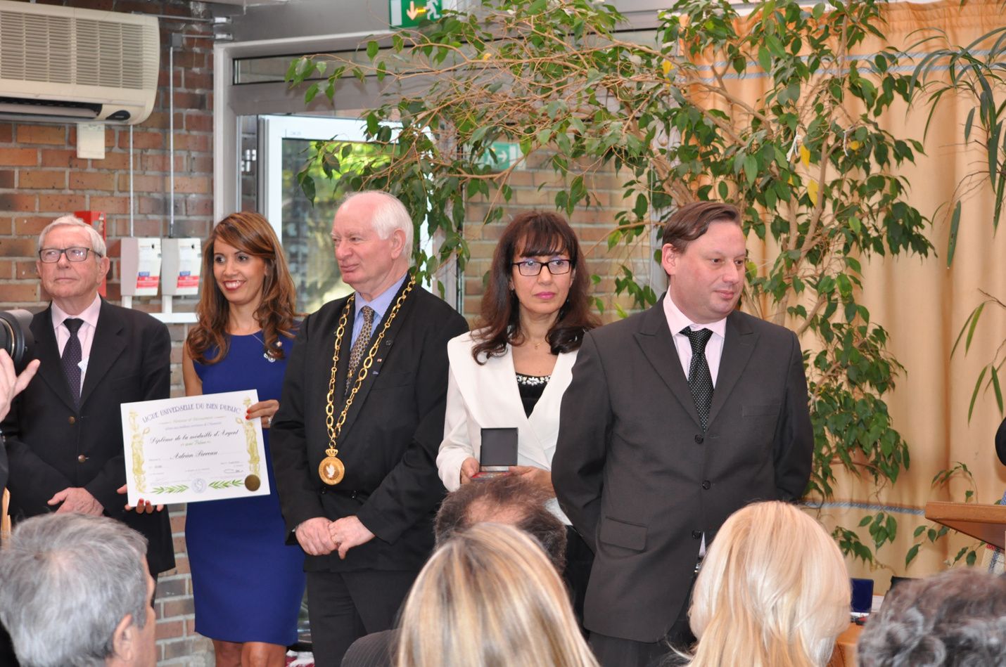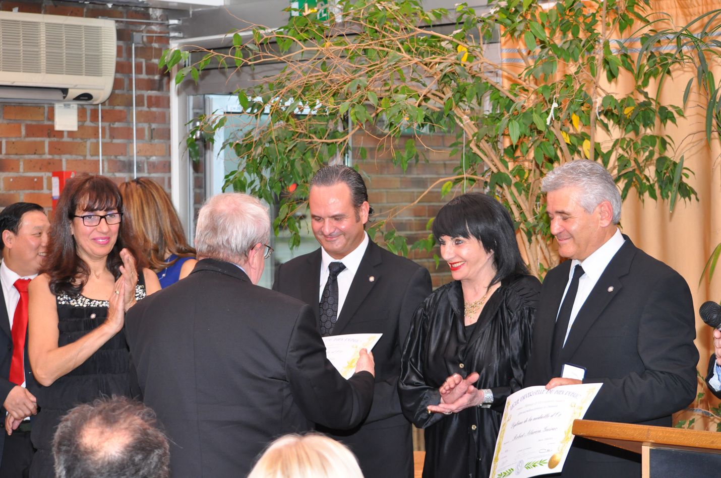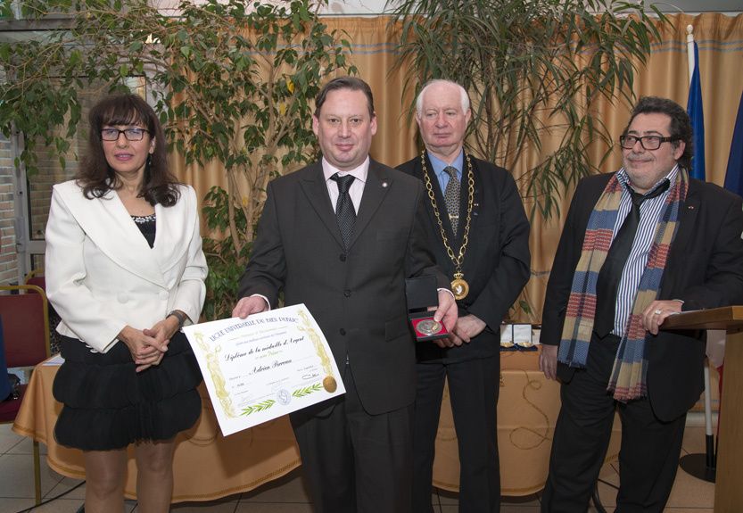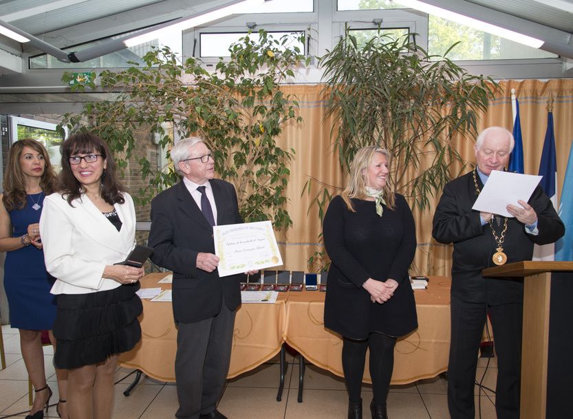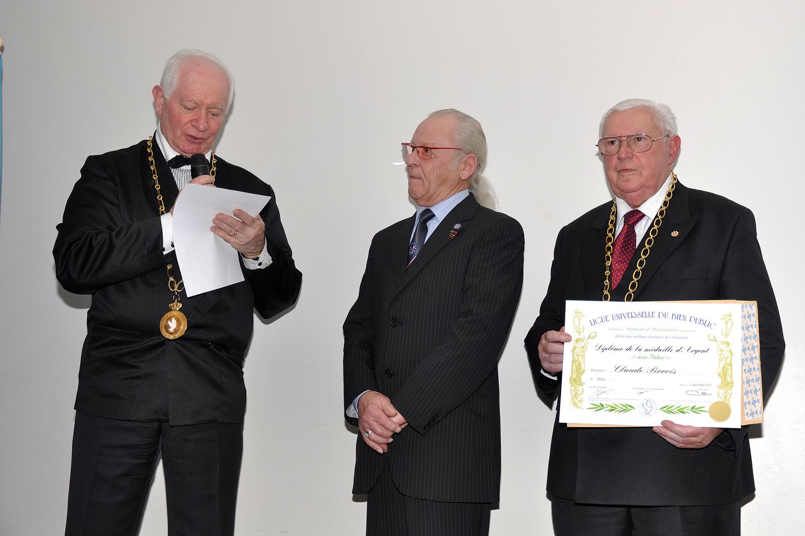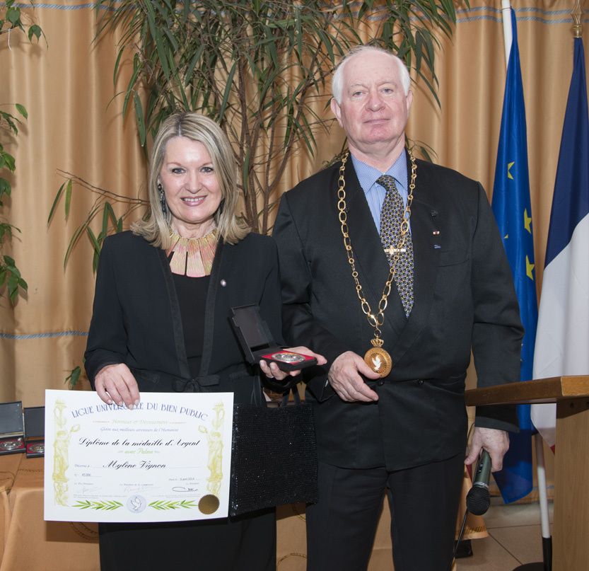 Votre personnalité, votre assiduité et votre bénévolat, vous vaut aujourd’hui à recevoir la médaille d’Argent de la Ligue Universelle du Bien Public.
