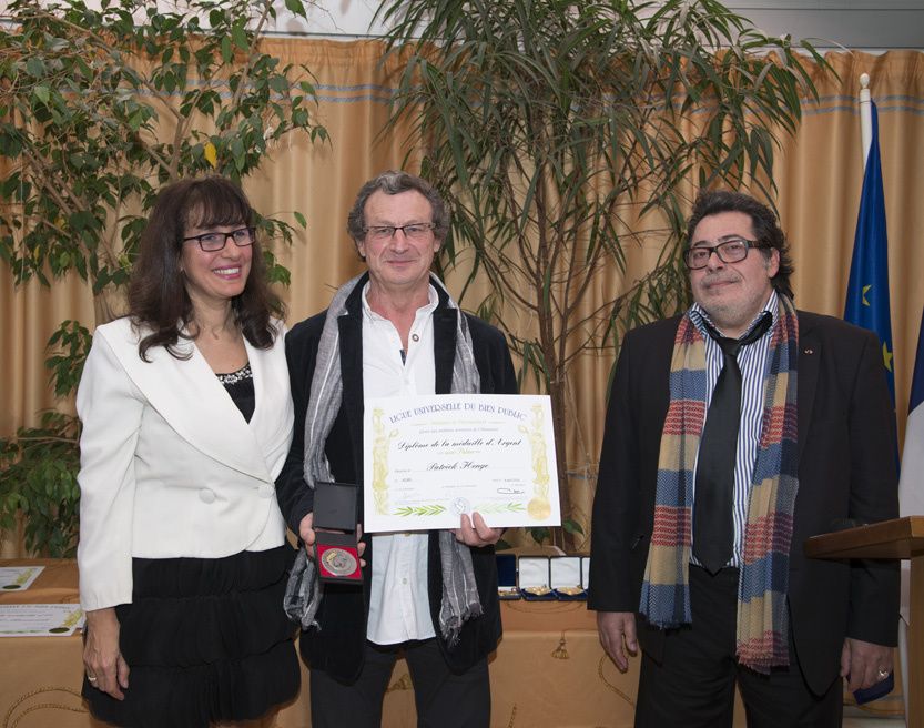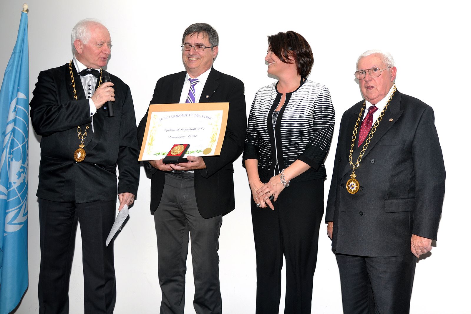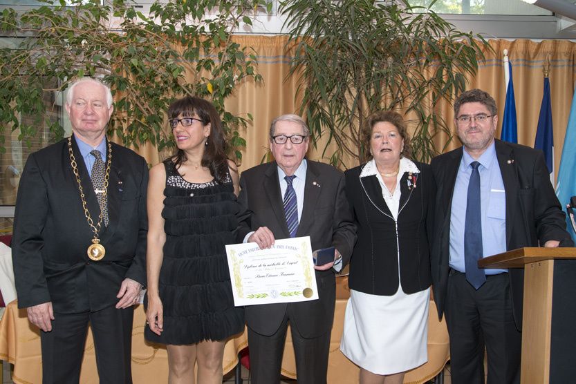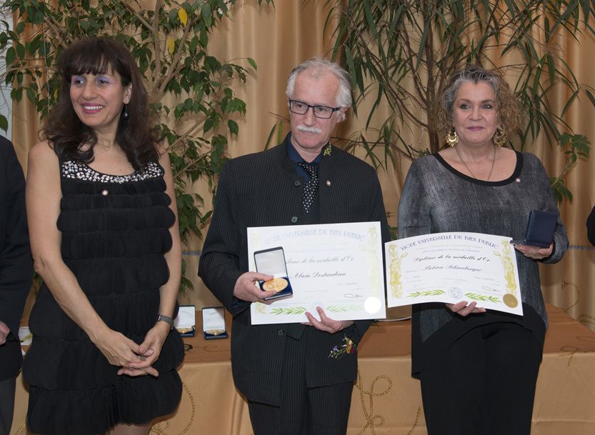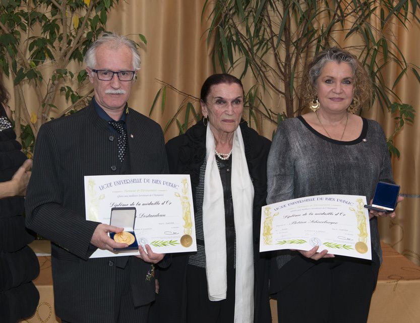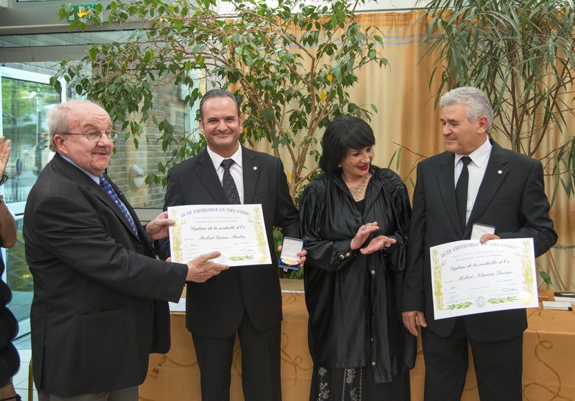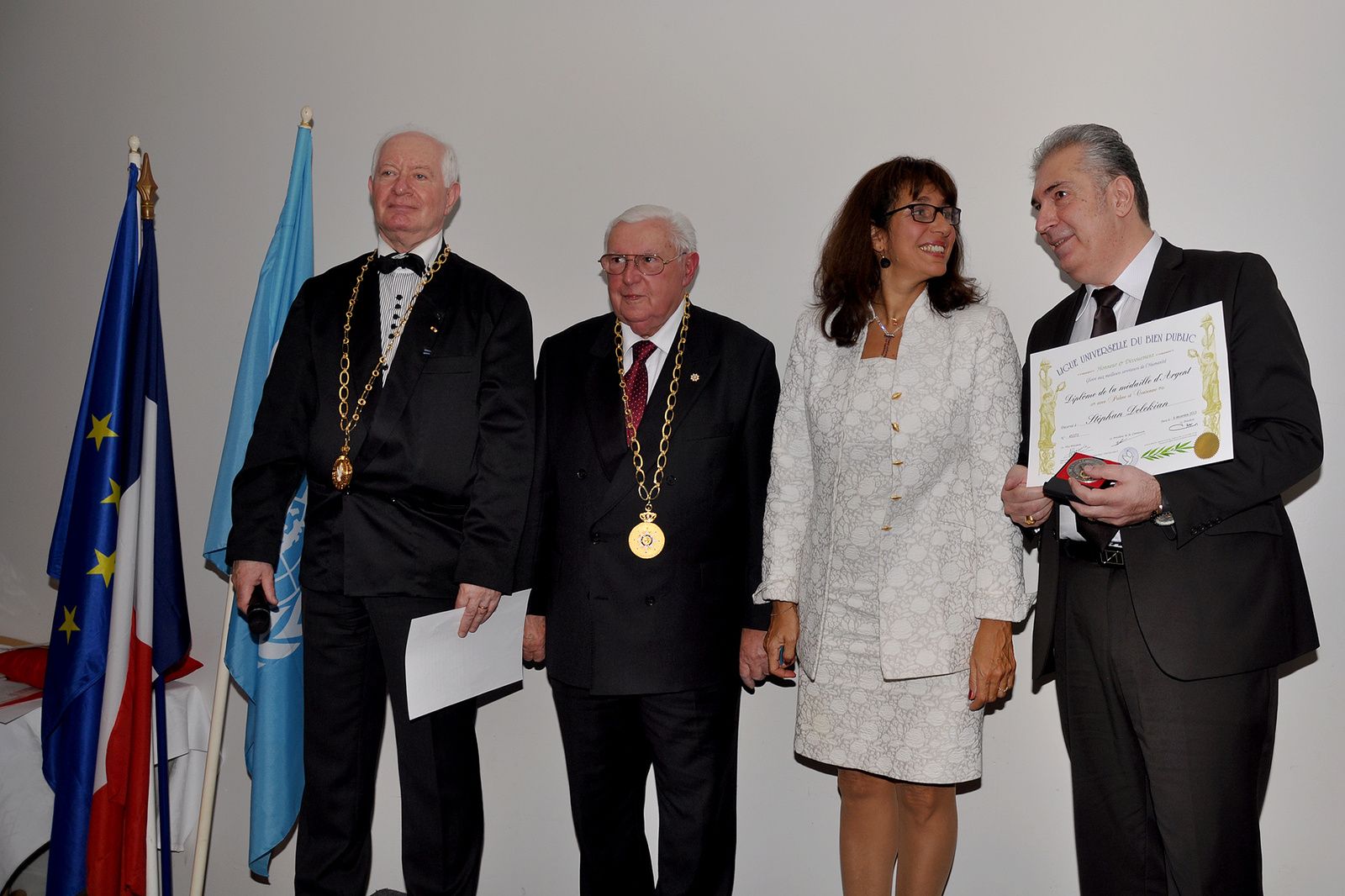 C’est à ce titre et pour toute la richesse de votre histoire personnelle que la Ligue Universelle du Bien Public est honorée de vous accueillir dans ses rangs et de vous remettre sa médaille d’argent avec Palmes et Couronne.