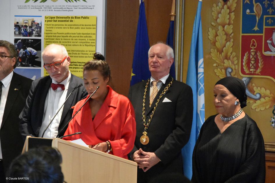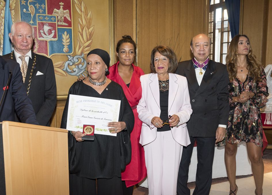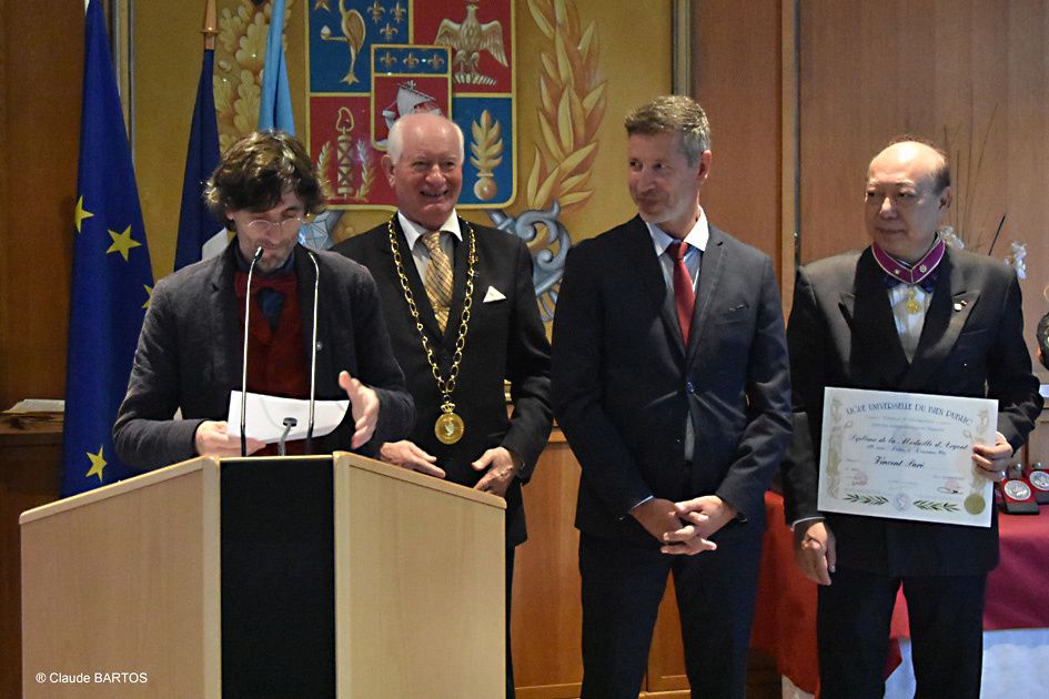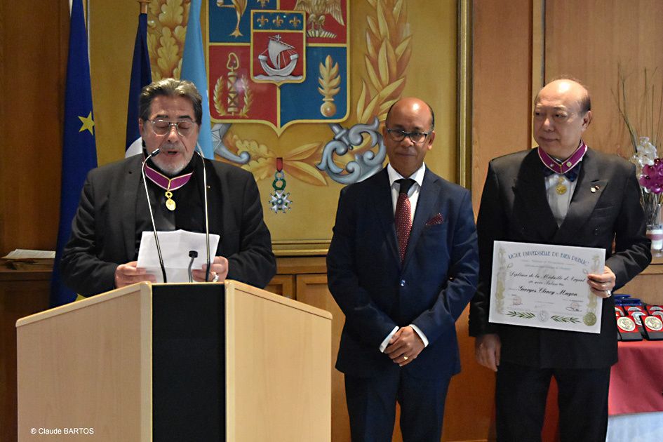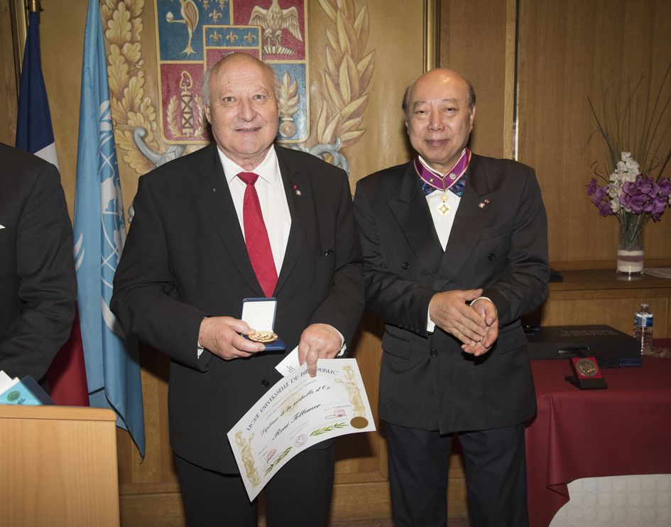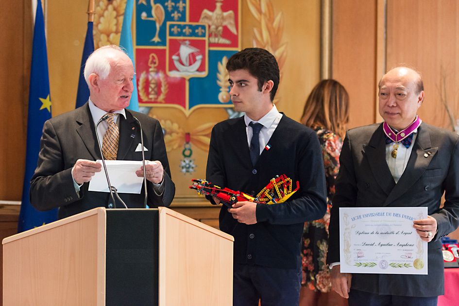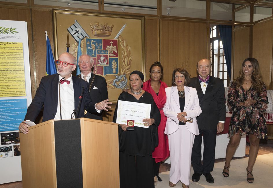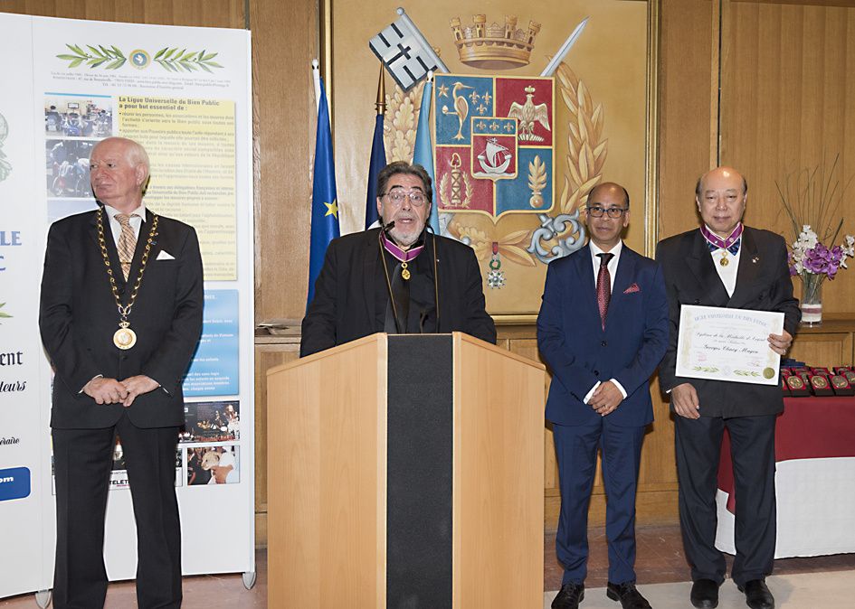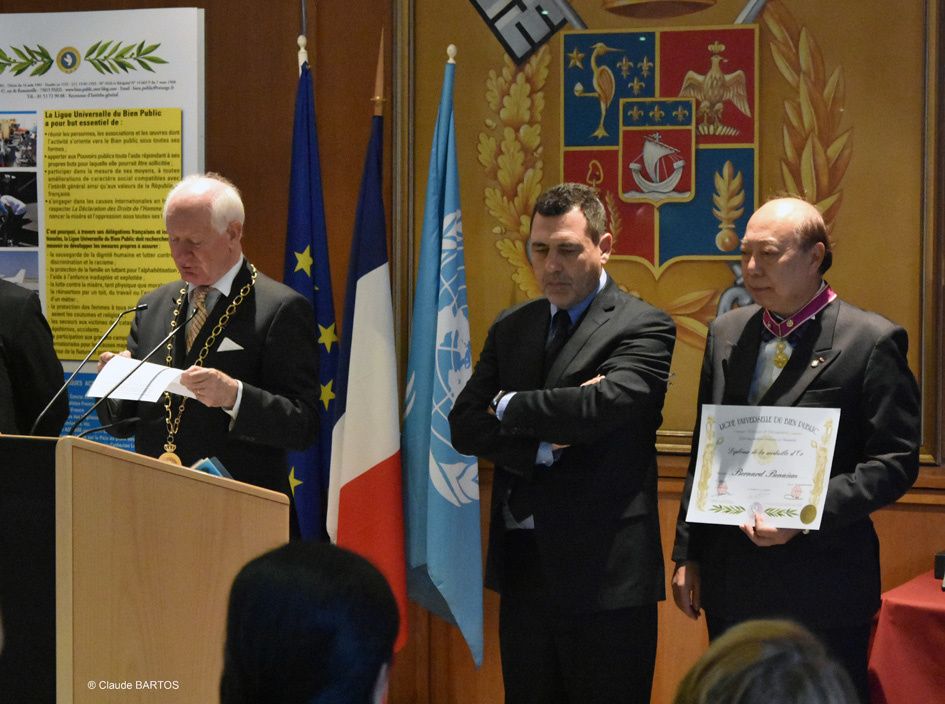 Pour votre implication dans le Bien Public, la Ligue Universelle du Bien Public est honorée de vous remettre sa médaille d’Argent avec Palme.